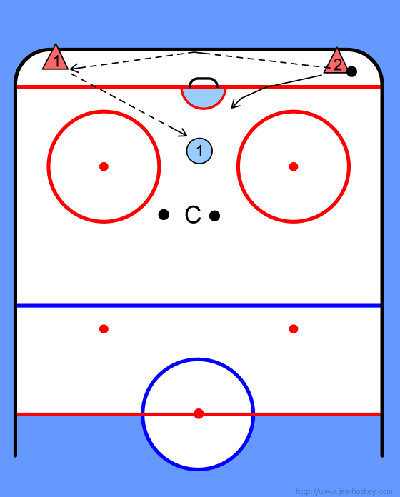 2. D retrieves and makes a D to D pass than hurries to the front of the net.