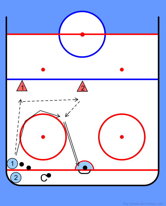The coach then carries the puck behind the net and passes out to F1 who is waiting to one time the pass.