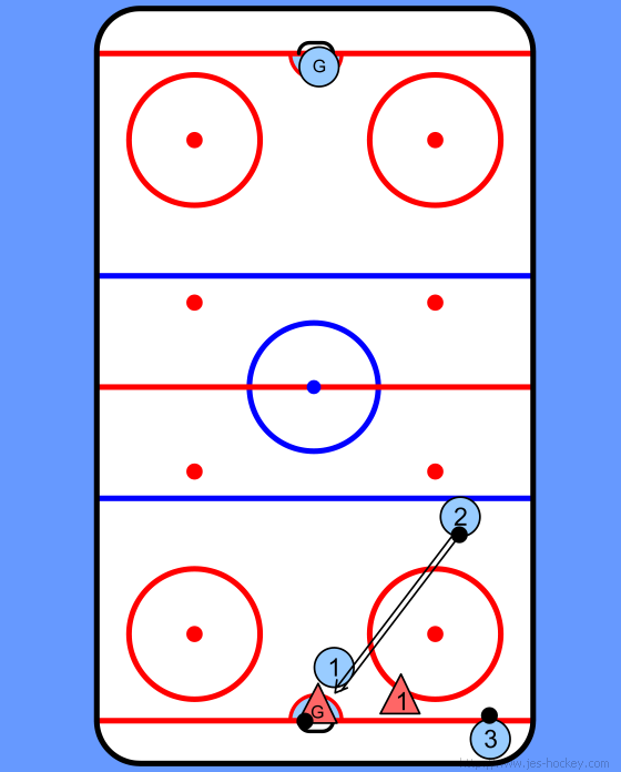 Note - this drill can be run (on the whistle) out of both ends of the ice, particularly if the pass is banked off the boards and the 1-on-1 is on halve the width of the ice.