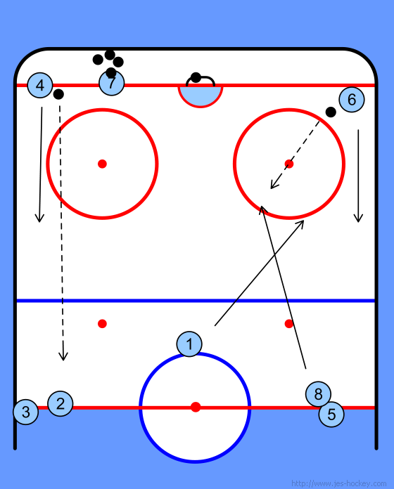 Player 1 gives a pass to player 6 and follows the puck.